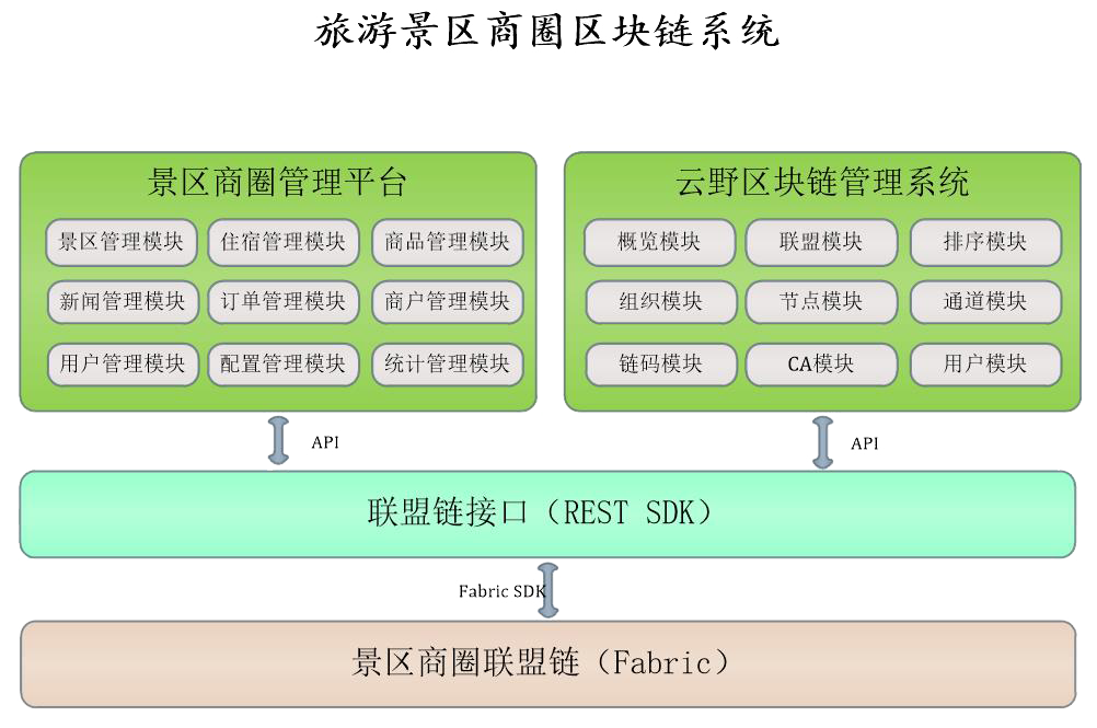 旅游景區商圈區塊鏈系統是建立在Hyperledger Fabric聯盟鏈區塊鏈基礎之上,以景區作為節點,實現以景區為中心的商圈管理系統。本系統分為景區商圈聯盟鏈、聯盟鏈接口和景區商圈管理平臺三大子系統。