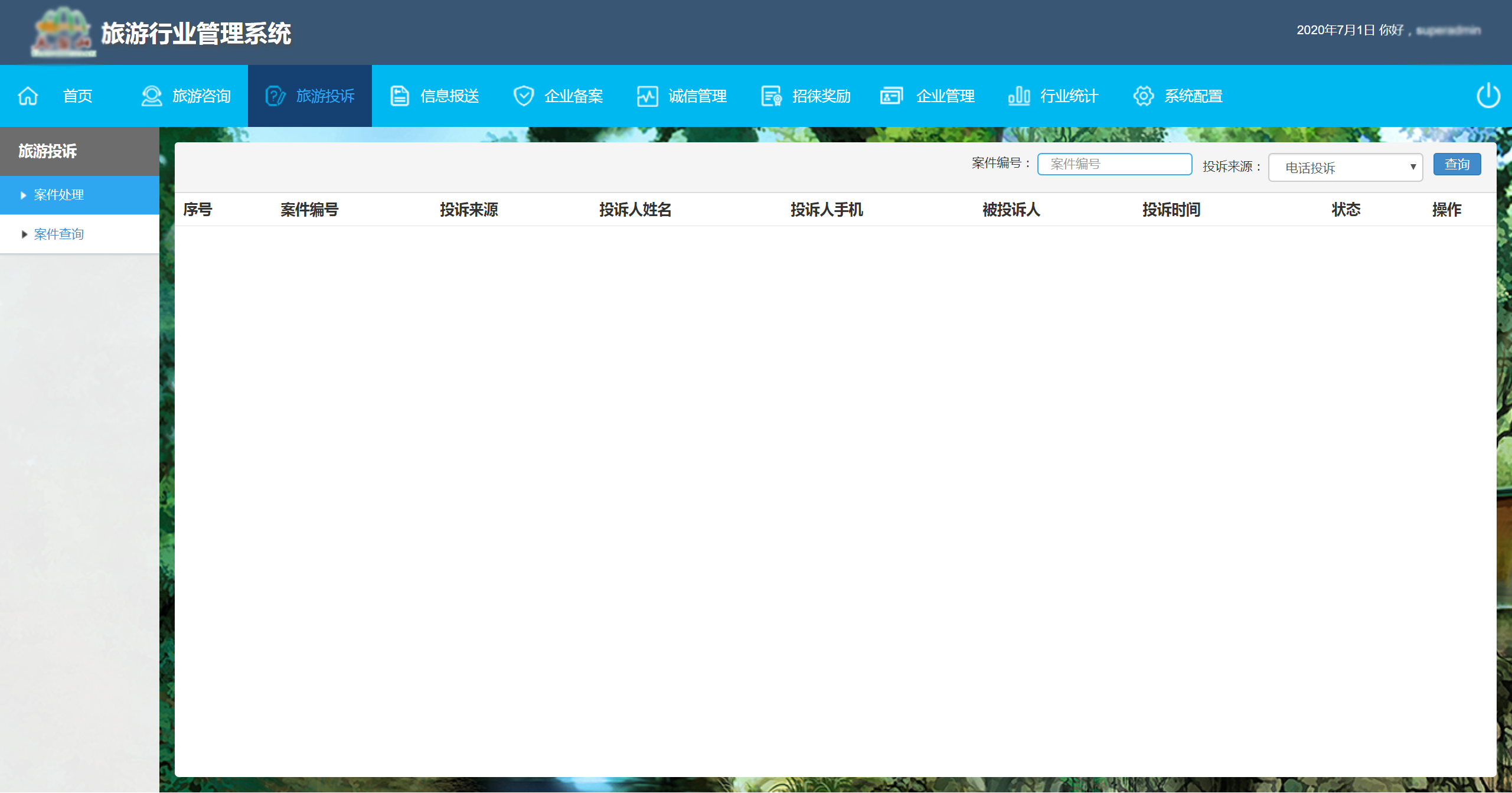 包括咨詢與投訴管理、旅游行業與涉旅企業管理、旅游誠信管理等子系統,提供游客投訴渠道,對游客投訴的問題進行流程化處理、追溯,提升游客游覽滿意度。圍繞旅游企業信息報送、旅游企業備案、旅游業態評定、旅游行業統計、旅游從業人員管理、游客招徠獎勵等全方位管理。針對涉旅商家的誠信評價、不良商家曝光、投訴反饋、商家信用等全面監管。