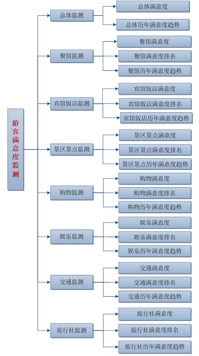 ● 總體監(jiān)測(cè):監(jiān)測(cè)當(dāng)前游客對(duì)旅游行業(yè)的總體滿意度,并分析歷年總體滿意度的發(fā)展趨勢(shì);