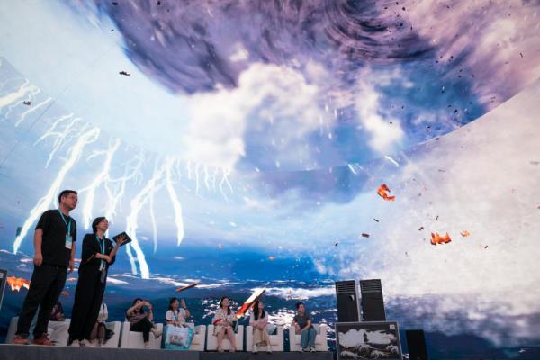 國內首個MR劇游式導覽系統《黑暗傳與大富翁》成為展會焦點。觀眾戴上MR設備后,仰頭能看到展館穹頂幻化為浩瀚星空,數十米高的盤古大神跨越人群,靈動的七色鹿在腳邊跳躍。